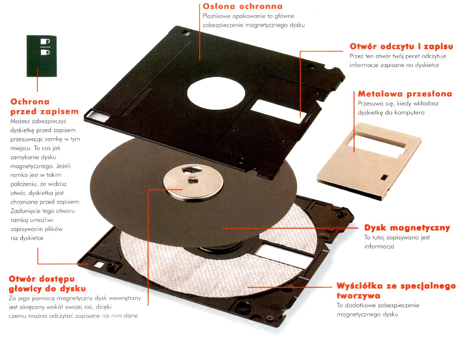 DYSKIETKI 5,25″ towarzyszą komputerowi PC od chwili jego narodzin. Dysk w nich jest wykonany z elastycznego tworzywa sztucznego (mylar) pokrytego warstwą materiału ferromagnetycznego (tlenki żelaza). Pierwsze dyski o formacie 5,25 cala posiadały pojemność 160 kB, w miarę zapotrzebowania na większe, nośniki rozrosły się do pojemności 1,2 MB. Dyski o pojemności 160 i 360 kB posiadały jednostronny odczyt informacji, mimo tego nośnik pokryty był z obu stron ferromagnetykiem. Dyskietka ta posiada dwa otwory: pierwszy do uchwytu piasty napędu (jest on umieszczony na środku nośnika); drugi, zwany otworem indeksowym (znajduje się w pobliżu środka nośnika) określa początek ścieżki. Dysk umieszczony jest w kwadratowej koszulce wyłożonej wewnątrz białymi okładzinami, które zmniejszają tarcie oraz usuwają zabrudzenia z nośnika. Owalny otwór wycięty