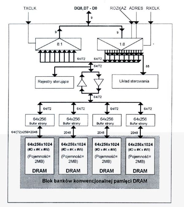 W pamięciach tych zastosowano nową koncepcję funkcjonowania. Informacja jest przechowywana w bloku standardowej pamięci DRAM. W opisywanej pamięci o pojemności 8MB (64 Mb) składa się on z czterech banków o pojemności 2MB każdy. Banki te są zorganizowane jako 1024 wiersze zawierające 256 kolumn 64-bitowych komórek (72 bity, uwzględniając kontrolę parzystości). Pojemność wiersza wynosi więc 2048 bitów.