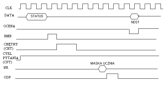 Ustawienie linii CPT w stan wysoki oznacza, że aktualnie będzie realizowany cykl odpytywania. Na linii DATA pojawia się słowo statusowe informujące o zakresie materiału. Sygnał BMB (bomboniera) jest wystawiany przez ucznia. Może on być ciągle w stanie H i wtedy cykl pytania zostanie odwołany. Jeżeli zostanie ponownie ustawiony w stan L to cykl jest realizowany dalej. Profesor wysyła sygnał CHT pytając czy jest ktoś chętny. Może on docierać do wszystkich uczniów lub do wybranych. Po przekroczeniu czasu ciszy (2 cykle zegarowe) na linii NR pojawia się numer ucznia od którego profesor żąda bajtu danych. Sygnał ODP sygnalizuje, że uczeń podjął próbę przesłania danych. Jeżeli trwa to zbyt długo to sygnał OCENA przechodzi w stan niski, a w dzienniku pojawia się wpis NDST. ![]() |